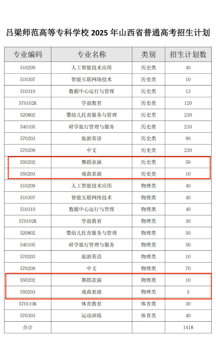 本文为大家整理的是吕梁师范高等专科学校2025年艺术类招生计划,主要包含招生专业、各专业招生人数等信息,希望对大家有所帮助,如有变动或异议,请以各省市教育考试院或学校公布的信息为准。